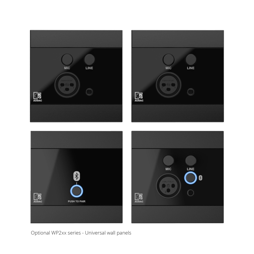 A remote input connection implemented through an RJ45 connector allows wall panel connections, expanding the system through remote input modules. Control up to 4 ARES5A sets (8 speakers) with the WP2xx series remote wall mixers.