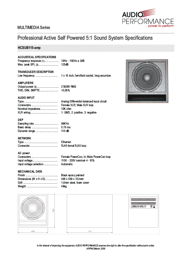 The HCSUB115-amp is a professional active self-powered subwoofer dedicated to a home theater system. Special care has been taken designing the subwoofer since it’s the bedrock of any good cinema reproduction system. An impressive maximum peak SPL of 125 dB and the incredible frequency response down to 19 Hz transforms every soundtrack to an ultimate acoustical experience.