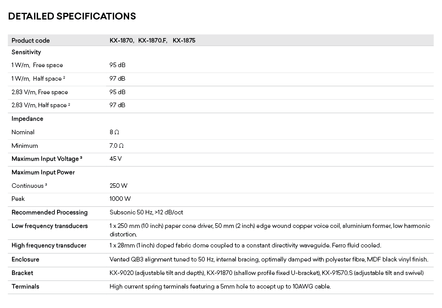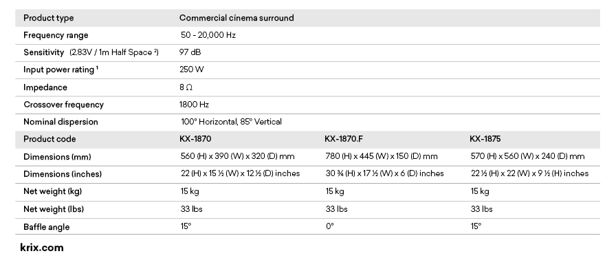The KX-1875 cinema surround loudspeaker offers high power handling and high sensitivity. Its low profile was developed to better suit auditoriums of limited width where the protrusion of the surround loudspeakers into the listening space should be restricted.